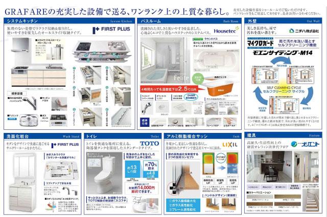 | 補 足 | 仲介手数料無料、フラット35S利用可能、ZEH水準仕様、JHS地盤保証システム(10年保証)、住宅瑕疵担保責任保険、Low-E複層ガラス(遮熱タイプ)、給湯器エコジョーズ、システムキッチン(オールラウンド収納・浄水器内蔵型ハンドシャワー)、ユニットバス(自動湯はり・換気乾燥機・ワンタッチシャワーヘッド)、トイレ2ヶ所(ウォシュレット・W節水)、キッチン床下収納、居室・収納・廊下部分フローリング、建物内各居室BS対応TV配線、24時間換気システム、防湿コンクリートベタ基礎・基礎パッキン使用、シロアリ駆除(保証書付)、設備:都市ガス、公営水道、本下水 | ||