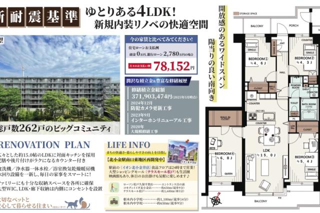 | 補 足 | 仲介手数料無料、大規模マンション、ペット飼育可(規約有り)、新耐震基準、南東向き、陽当り良好、アフターサービス保証、リノベーションマンション【リフォーム内容(2025/12完了予定):システムキッチン交換 ユニットバス交換 洗面化粧台交換 トイレ交換 クロス全室貼替 床材貼替 ハウスクリーニング】 | ||