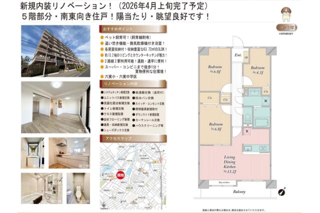 | 補 足 | 仲介手数料無料、ペット飼育可(規約有り)、南東向き、陽当り良好、リノベーションマンション【リフォーム内容(2026/4完了予定):システムキッチン交換 ユニットバス交換 洗面化粧台交換 トイレ交換 クロス全室貼替 床材貼替 ハウスクリーニング】 | ||